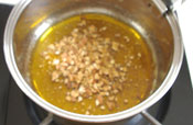 3. グラニュー糖がとけ、薄いきつね色になったらアーモンドを入れます。 カラメル色になるまでヘラでまぜながら弱火にかけます。