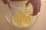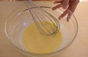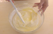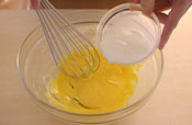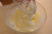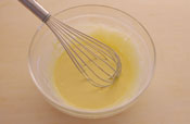 1. 卵黄をほぐし、グラニュー糖を入れすりまぜる。 もったり白っぽくなるまでしっかり混ぜておく。 |