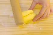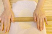 6. 冷えたら少したたくか揉んで堅い芯を取り除き、麺棒で薄く広げ、 伸ばす。板につく場合はオーブンシートにはさむと伸ばしやすい。 |