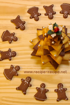 今回は普通のクッキー生地をクリスマス用にしています。 ジンジャーパウダー・シナモン・クローブスパウダー等を適量と、 はちみつも大さじ1杯程度入れていただくと 少し色の黒い、日持ちのするジンジャーマンクッキーに 仕上がります。 (その場合はココアと同じタイミングで入れます。)