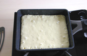 5. 温まったら生地の1/2を流し入れ、プクプクと泡が出てきたら裏返して弱火で焼く。 できたら、もう1枚焼く。