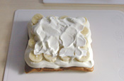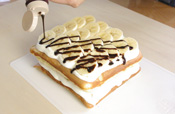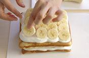 7. 生地の間に、1/2のクリームを塗り、5mm厚の輪切りバナナを敷き、さらに生クリームを塗ってもう1枚の生地を重ねる。