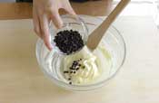 3. 木べらにかえてチョコチップを加える。