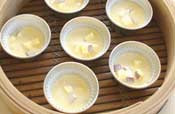 7. カップにグラシン紙をいれ入れ、生地を8分目まで入れる。 蒸気の上がった蒸し器で15分蒸してできあがり。