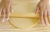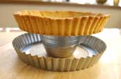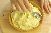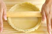 5. 冷えたら軽くもんでのばし、タルト型にしきこむ。 しきこんだら、角を出し、麺棒で上下にふちを落としていく。 |