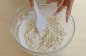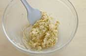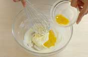 3. 卵を2回にわけてまぜる。 次に粉をふるいながら入れ、切るようにまぜる。 |