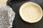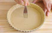6. ピケ(フォークで空気穴をあける。)重石をして焼く。180℃で15分したら、重石を取ってさらに15分焼く。きつね色に焼き上げる。 |