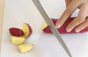 7.さつま芋のフィリング さつま芋を乱切りにし、水にさらしあくを抜く。 お鍋においもを入れ一センチ程度かぶる位のお水を入れ柔かくなるまで茹でる。 竹串がスッと入る程度。