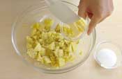 9. つぶしたさつまいもが温かいうちにバター、グラニュー糖を入れ混ぜながら溶かす。 シナモン、塩、コンデンスミルク、生クリームで味と硬さを整える。 |