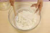 1. だんごの粉を使いだんごを作る。 粉に水を入れ、木べらで水を分散させ、手にかえて捏ねる。 |