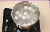 3. 捏ねあがったら丸めて(1個18g程度)茹で上げる。 茹でる時は沸騰した湯に入れ、浮いてから弱火で5分程度ゆでる。 |