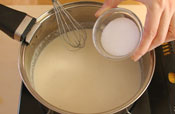 3. 火にかけ沸かす。 湧いたらグラニュー糖と塩で味をつける。