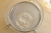 3. 薄力粉をふるいながら入れる。 さらに混ぜ、残りの水を少しづつ入れながらダマにならないように混ぜていく。