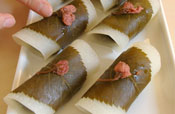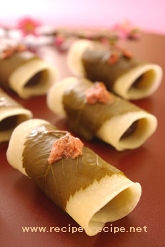 7. 生地が冷めたらあんを包み、桜の葉を巻く。 |