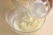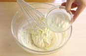 5. 薄力粉をふるい入れながら混ぜる。 卵を1つずつ加え混ぜる。 |