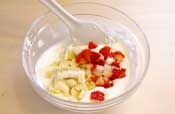 フルーツ5mm程度の角切りにしておく。 今回はバナナとイチゴを使用。