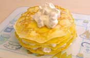 7. クリームを6等分し全体に広げ、2枚目を重ねる。更にクリームをぬり、7枚分のクレープにサンドして重ねていく。 |