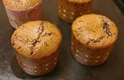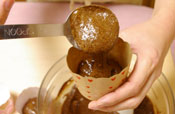 11. マフィンカップの1/3くらい生地をスプーンで入れ、カットしておいたガナッシュを1粒真ん中に入れ、少し押さえておく。 |