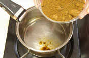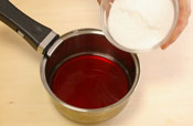 鍋に水とグラニュー糖、または黒糖を入れて煮つめ、3の様な状態になればできあがり。 |