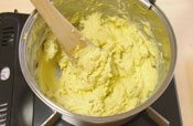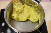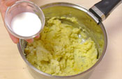 4. 牛乳・生クリームを入れ練る。 生クリームは牛乳で代用しても大丈夫です。