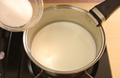 2. お鍋に牛乳を入れ、半量のグラニュー糖を入れ沸かす。