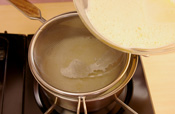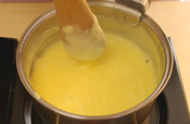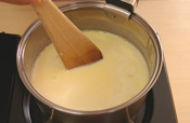 作り方7番のとき、固まりかけたときこそよく混ぜるのがポイント。 こわがって火からはずすとだまになってしまいます。 |
