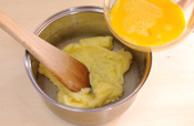 その都度よく混ぜ、生地がつながってから卵を入れていく。