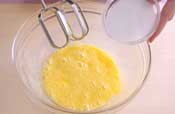 2. グラニュー糖を加え、ハンドミキサーで泡立てていく。