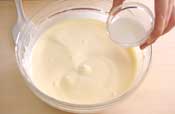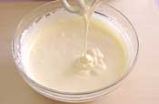 4. 牛乳をまわしいれ、ゴムベラで合わせる。 |