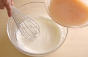 6. 生クリームを混ぜながら、5のピュレを加える。 均一になるまで混ぜる。 |