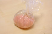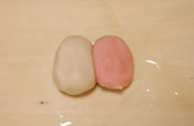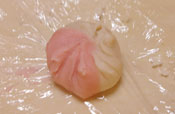 6. ラップに白餡30gとピンク餡20gをのせ丸く包む。 |