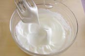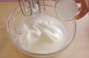 軽くツノがたったらグラニュー糖を半分入れさらに立てる。 (最初はあまり立てすぎないようにする) |