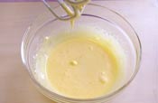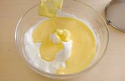 4. メレンゲのボールに卵黄を入れゴムベラで混ぜる。 |