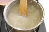火にかけて透明になってから少し練らないと 粉っぽい食感になりますので完全に透明になるまで 火にかけてください。 |