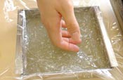 ラップをかけて、手で平にならす。 熱いので手をやけどしないように注意する。 |