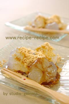 7. 5の場合は冷えたらすぐに氷水からあげて皿に盛る。 きなこや黒蜜をかけてできあがり。 |