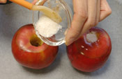 グラニュー糖とシナモンを混ぜ合わせ、くりぬいた部分につめます。 |