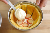 泡立った生クリームをボールの1/3位スプーンで入れ、イチゴを並べます。 |
