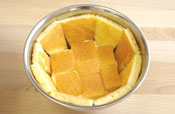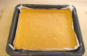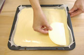 9. 生地が焼けたら天板からはずし、ペーパーをはがして冷ます。 ボールのサイズに合わせ生地をカットする。