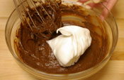 ホイッパーをはずしゴムベラに変え、残りのメレンゲの半分を入れマーブル状まで混ぜ合わせる。