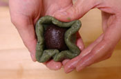 餡を抑え、周りの皮をのばすようにするときれいに仕上がります。 |
