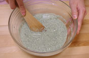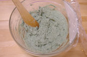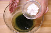 大き目のボールに分量の水を入れ(280g)乾燥よもぎ粉をふやかす。 |