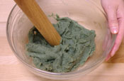 よもぎ粉がふやけたら、上白糖を入れ木べらでまぜる。 |