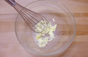 割ほぐした卵30gを3回に分け入れて、まぜる。 その都度クリーム状になってから次といれること。 |