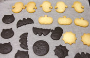 オバケやかぼちゃ、猫などのクッキーの抜き型が無くても大丈夫。 丸や四角に焼いたものに絵を書けば良いのです。 |