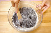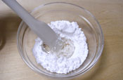卵白を粉砂糖の中心にいれ、中心から少しずつ混ぜてゆく。 |
