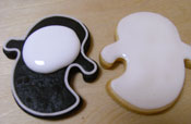 パイピングにアイシングを入れて、まず形にそってラインを書き、固まったらゆるめにしたアイシングを流して広げる。 |
