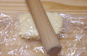 生地がまとまってきたら、ラップにとりだし、平らにして冷蔵庫で冷やす。 |