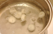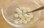 お鍋にお湯を沸かし、白玉をゆでる。 |