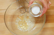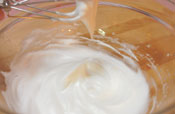 ミキサーの場合は卵白を軽く溶きほぐしたら、グラニュー糖を一度に全部入れてたてます。 手で立てる時はグラニュー糖を2回程度に分け入れてメレンゲをつくる。 |